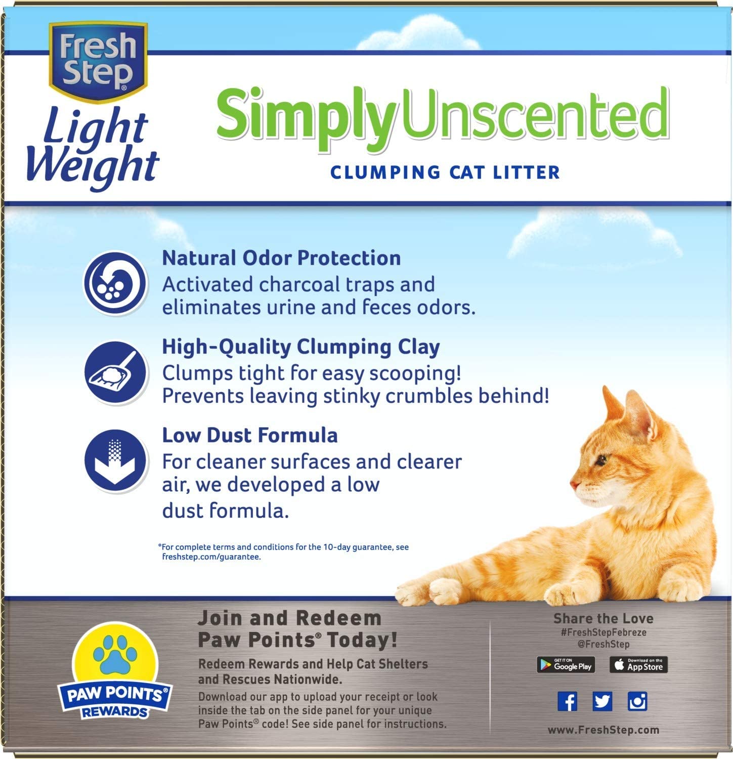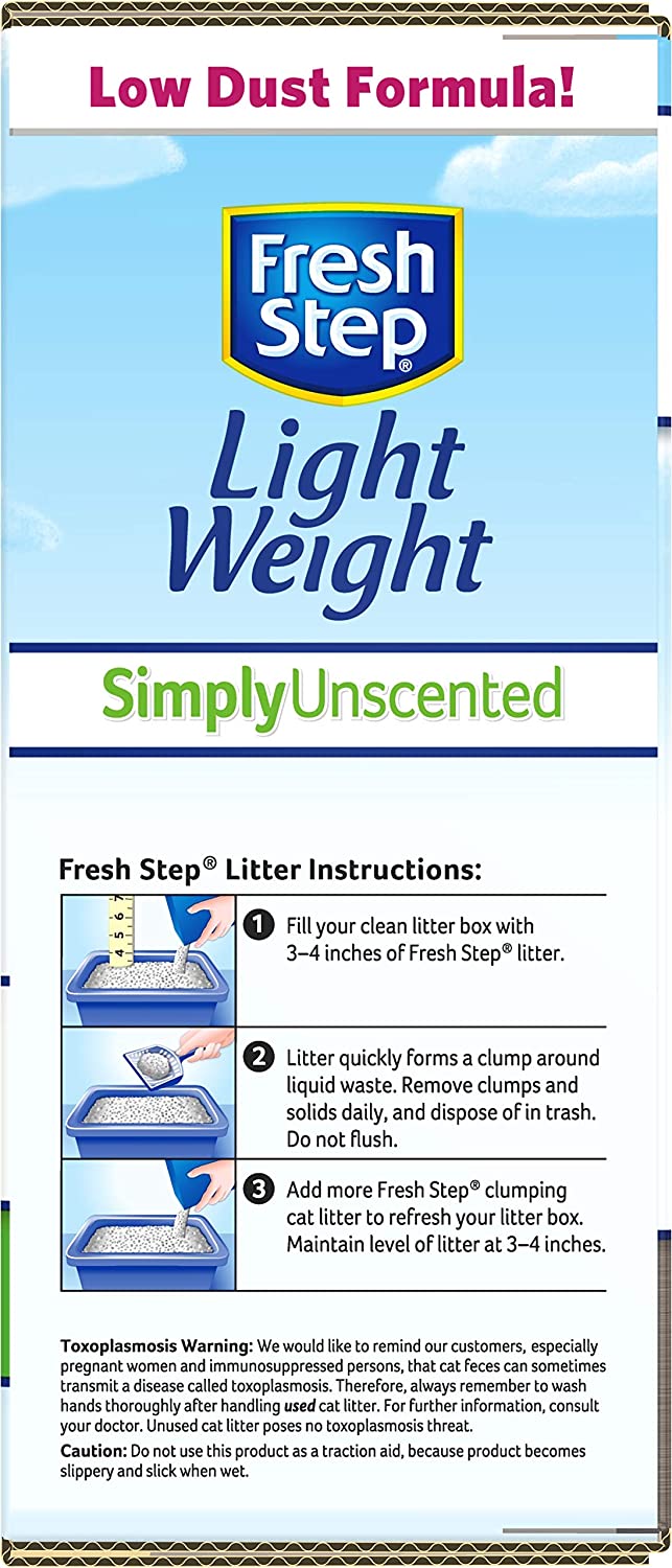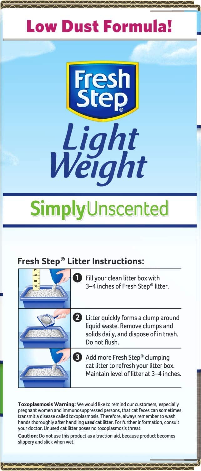 FRESH STEP LIGHTWEIGHT CAT LITTER: This unscented Fresh Step cat scoopable litter is created with your cat’s health and happiness in mind in a lightweight formula that’s easier to lift, pour, and store