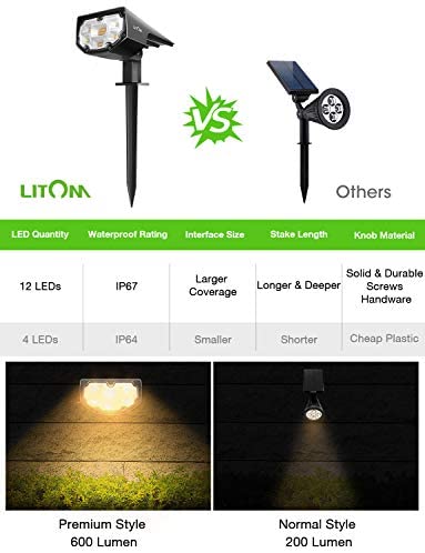 Warm White Solar Spotlights: Brighter 12 LEDs with Wider 120°Lighting Angle & 90°Adjustable Bigger Solar Panel & Longer Working Time with 18650 lithium rechargeable battery. LITOM solar landscape light is much more unique, fashionable and practical compared to other 4-6 LED lights in the market.
