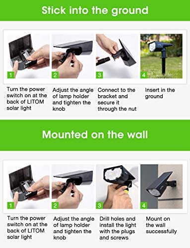 LITOM solar spotlights can be widely used for garden, pathway, fences, wall, yard, stair, garage, cellar, attic, front porch, balcony, walkway, driveway, camping, fishing, etc.