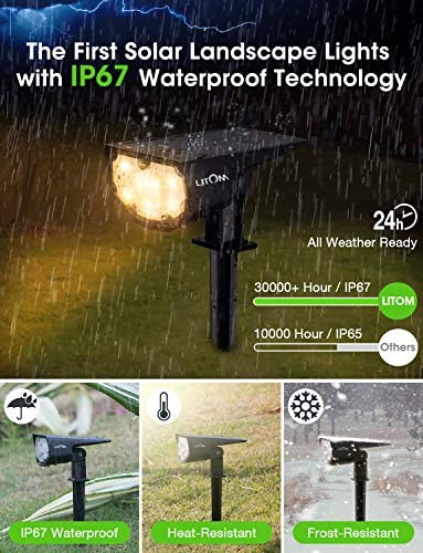 Leading IP67 Waterproof Technology: Made of high-impact ABS plastic and having been enormous technological breakthroughs in waterproof grade, LITOM outdoor solar lights have unique IP67 waterproof design and can withstand all kinds of terrible weather. Much more durable than other less waterproof grade lights.