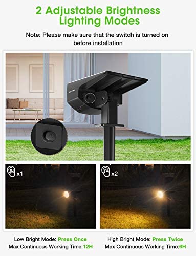 2 Brightness Lighting Modes(Always on): Low Light Mode(12hrs) / High Light Mode(6hrs). LITOM solar landscape spotlights can automatically detect changes in the brightness of the external environment. When the brightness is low enough to require illumination, it will automatically switch from energy storage mode to lighting mode without motion detection (Auto on at night / Auto off at sunrise).