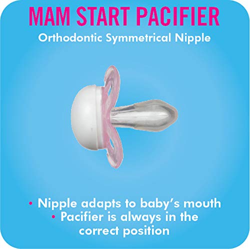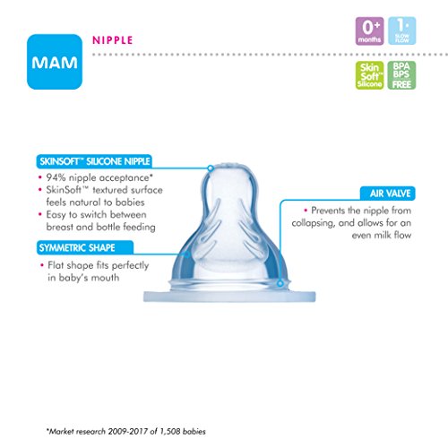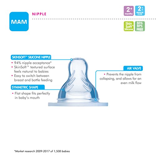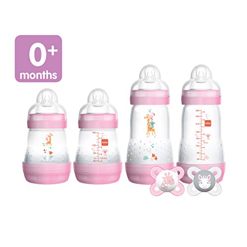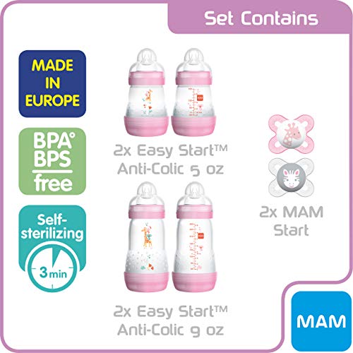 PRODUCT DETAILS – MAM Newborn Essentials “Feed & Soothe” Set includes: Two 5-oz anti-colic bottles with 2 Slow Flow silicone nipples, Two 9 oz anti-colic bottles with 2 Medium Flow nipples, & two 0-2 Month pacifiers with orthodontic nipples.