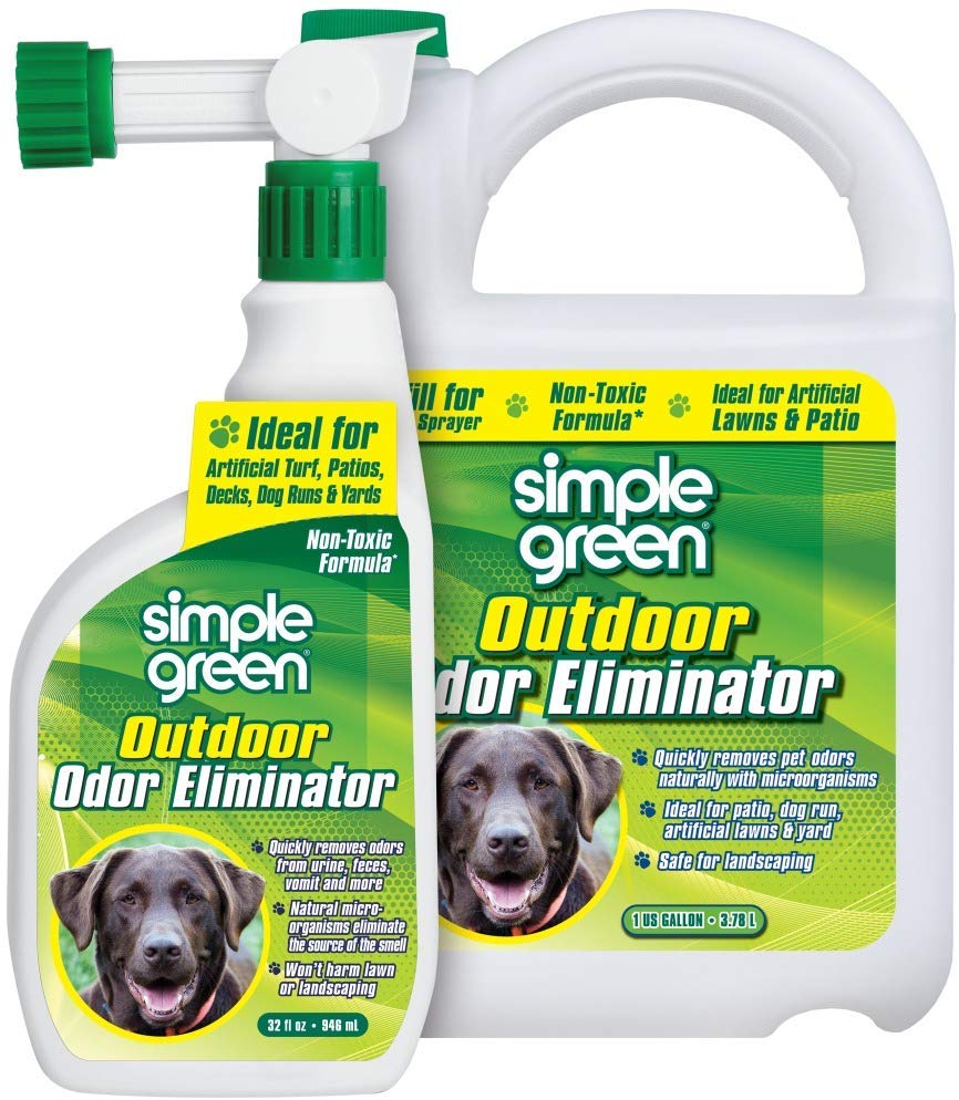 Simple Green outdoor odor Eliminator removes odors left behind by urine, stool, vomit and other organic matter. The orally non-toxic formula uses powerful, natural enzymes to eliminate odors at the source on grass, turf, gravel, concrete and more. It is safe for use on patios, decks, and in dog runs And yards and leaves behind a fresh, clean scent.